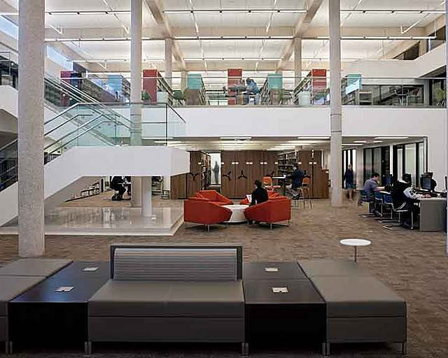 While the new student center was inserted into an existing u-shaped form of the main campus building, the library renovation posed a new set of issues and challenges. The library resides in the very center of the main campus building. While clerestory elements were built into the original design, many areas of the library were dark and lifeless. Getting natural light into the middle of the building was difficult, and cutting new openings into the existing concrete waffle-slab designed roof was not an economical solution. The two-part solution led to incorporating large skylights into the roof structure of the student life center, thereby flooding the adjoining space with natural light while removing building elements between the two spaces that would block or diffuse the light. The result was that more light was able to reach the library into strategically located study areas and research carrels.