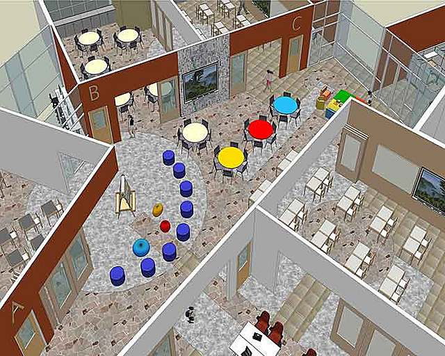 A 21st century learning environment requires a new approach to the current media center. It is an environment where students have the opportunity to discover, explore, produce information and products for the projects. Tablet technology has changed the learning process and soon books will be a novelty. With this in mind, the information center shall have learning hubs, be technologically-rich with a more virtual approach and therefore become smaller than the past. It is located directly off of the learning street and is lined with glass walls so the technology rich environment is always on display to the students and the community. The global resource center is a highly collaborative technology-rich environment where the student is connected to the larger global world.