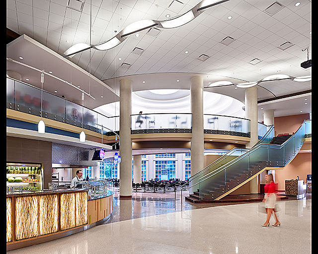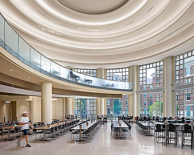 The 29,658 square foot Anita and Truman Arnold Dining Commons has a naturally lit rotunda offering 250 seats and can be closed off for private diners. The two-story dome with a glass curtain wall is high performance glass (controlled by an iPad) that allows students and faculty to sit comfortably by the windows in the hot Texas sun.