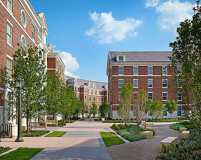 The Collegian Georgian style architecture seen throughout the project is aligned with the architectural history of the university, going back to SMU’s original President’s appreciation of Thomas Jefferson’s design for the University of Virginia. Stately, red brick Collegiate Georgian buildings can be seen throughout the campus, the new Commons, and the Dining Commons’ rotunda pays tribute to the University of Virginia Rotunda. Green spaces are found within the quad and allow students to see and be seen while walking to class or the dining hall.