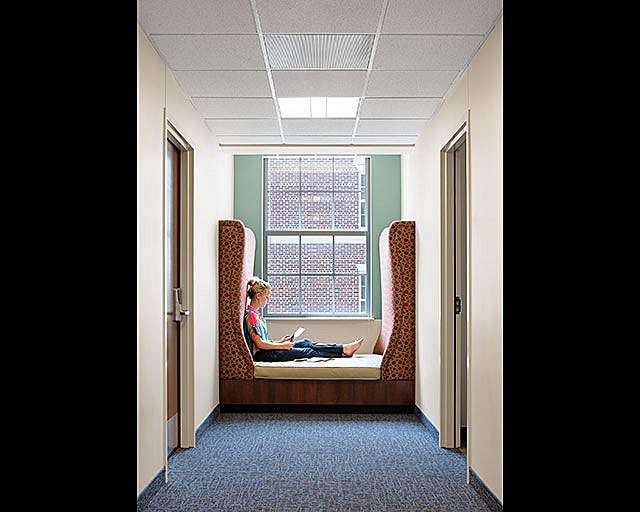 While the entry and center of each residential commons expresses a classical aesthetic aligned with the Georgian exterior and is focused on symmetry, the corridors, lounges and private spaces for residents express a more traditional aesthetic and a design that incorporates curves and angles.