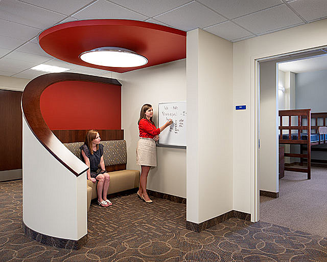 Interior highlights include lounges that feature tray ceilings with inlaid wood, travertine tile flooring, and leather seating. Faculty apartments have stainless appliances, granite counters and high-end bath fixtures providing all the comforts of a home off campus. Classrooms in the residence halls feature projection screens along with study tables for both lectures and group collaboration.