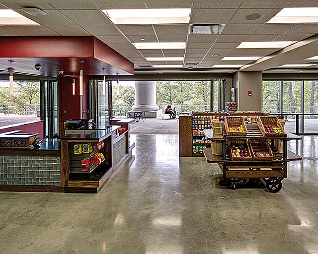 The facility is organized around a central atrium that connects all major functions physically and visually. The atrium is part of a free zone that welcomes visitors to campus and serves as the final stop on formal campus tours for prospective students. The facility also houses the First Year Experience (FYE) program, which provides support and resources to freshmen, enhancing student success. The building opens to an outdoor patio that overlooks a wooded park and the Black Warrior River.