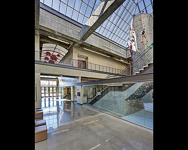 Natural materials and natural light define the interior aesthetic of this facility. Cast in place concrete is the primary structural system and is the primary interior finish. Accent colors are used to give life and additional visual excitement. Natural light floods the three-story atrium that orients users and creates visual excitement and a welcoming atmosphere. Glass encloses many of the major spaces including the three-court gym.