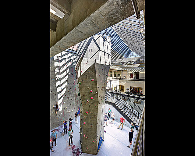 Just inside the entry is a large new climbing wall — a feature meant as an impressive introduction to the center, which rises nearly to the skylight above. In total, the building adds about 85,000 square feet of recreation space to the university’s capacity. The first and second floors are devoted to strength and cardiovascular training spaces.