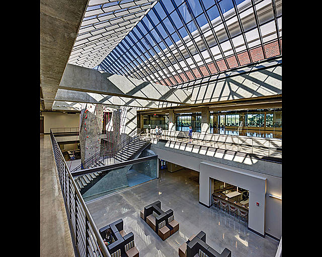 The center is unified by an entry concourse that provides a strong, striking and friendly image, while recreation users are treated to impressive views of the Black Warrior River. The lounge, adjacent to the “First Year Experience” freshman offices, provides a natural and compelling conclusion for campus tours. The recreation entry is a glassy control point that can be secured from the other building functions, allowing dissimilar scheduling to occur without compromising functionality. The building opens to an outdoor patio that overlooks a wooded park and the River.