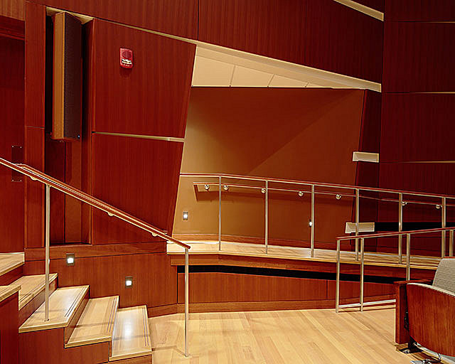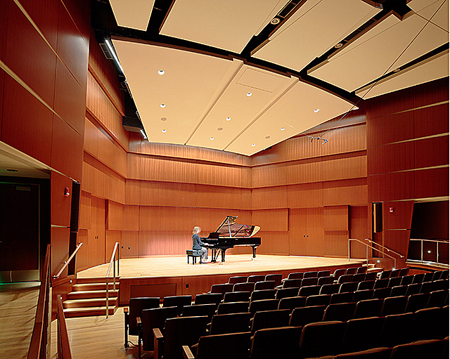 One of the projects main goals was to create an intimacy for the audience, both visually and acoustically. This was achieved by utilizing wood wall paneling and folded gypsum ceiling reflectors to shape a dramatic space that is warm and timeless and that links the acoustical environment to the visual experience of performing and listening in the hall. By extending the wood design from the stage out into theater, the application creates continuity and intimate communication between the performer and audience.