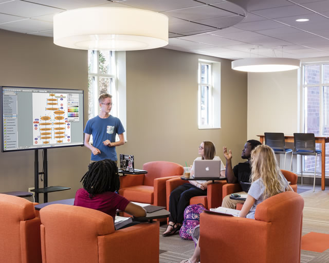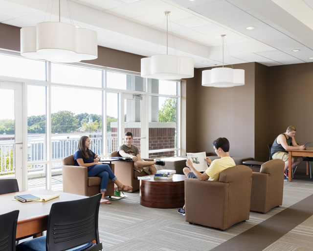 In selecting interior finishes, designers focused on creating an exciting new space with updated aesthetics, while maintaining a connection to the existing spaces on campus and honoring the history of Freed-Hardeman University. During several meetings among the design team, user groups and senior administration, factors such as durability, acoustics, space use and aesthetics were discussed, particularly with respect to the interior finishes. These factors then became the outline used to make finish selections. For example, hard surfaces were used in the first floor lobby for increased durability, while carpet was used throughout the majority of the remaining spaces to provide better acoustics and more comfort in study spaces.