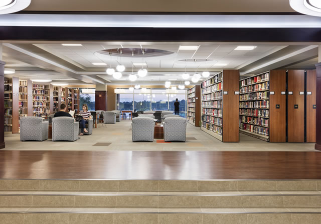 The updated interior architecture transforms the library space into a commons area that encourages and supports student collaboration and team-building. Inspired by evolving library typology that now trends toward open floor configurations, as well as the university’s focus on student collaboration and faculty mentorship, the interiors feature comfortable gathering spaces that facilitate student academic and social interaction. On the first floor, a café and learning commons serve as casual meeting places. The café, which has doubled its patronage after relocating from across the street, is particularly useful since food is permitted throughout the building. A flexible meeting room on the ground floor is utilized for university-wide events, board meetings, lunches and other functions and has its own entrance for access during library afterhours. A combination of group and individual seating arrangements contribute to the flexibility of the socialization spaces.
