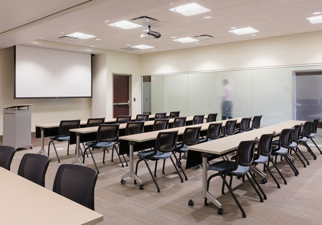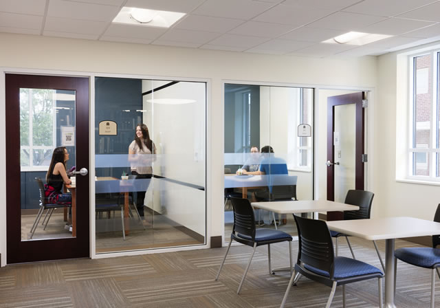The third floor functions as a tutoring center that provides resources for both students and faculty. Video-monitored testing rooms allow the university to administer tests outside of the classroom, while online content recording rooms with high-quality projection capabilities enable faculty to record online course material. Located among the testing and recording rooms are an assortment of discipline-specific study rooms outfitted with marker boards and other resource material to accommodate a full spectrum of academic needs that range from those students who need to catch up to those students completing honors research projects. These rooms support small group study meetings, as well as one-on-one tutorial sessions with on-site tutors, whose offices are just across the hall. Finally, a flexible, glass-walled conference room with a partition wall is used for faculty instruction and for training sessions, as well as for large-group tutoring or review sessions.