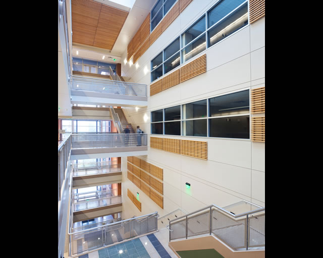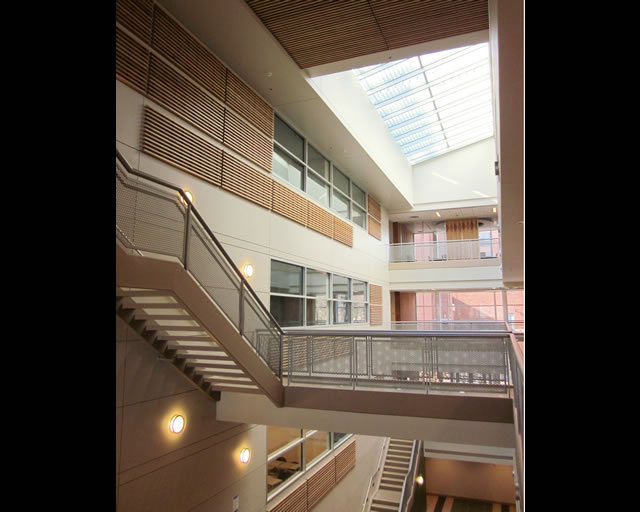 The stair step nature of the building is directly expressed in the profile of its atrium, a top-lit circulation and lounge space that rises from the first floor entry at the east to the fourth floor entry at the west. This is the desired focus for the department: a spatial integration of all floors that affords opportunities for chance meetings. Some labs directly overlook this space. Colorful quartz tile floors extend throughout the atrium and corridors, and accent paint colors in the various corridor alcoves are an economical and effective means to further enliven these spaces. Labs, offices and classrooms all also feature painted accent walls. All corridors terminate in exposures to the outdoors, these termini are also viewed as chance meeting points.  The extensive spatial requirements of mechanical equipment were largely met in the cavernous attic. Finally, the sixth floor incorporates some special functions: a commons room, lounges for faculty and staff, and a terrace with expansive 180° views.