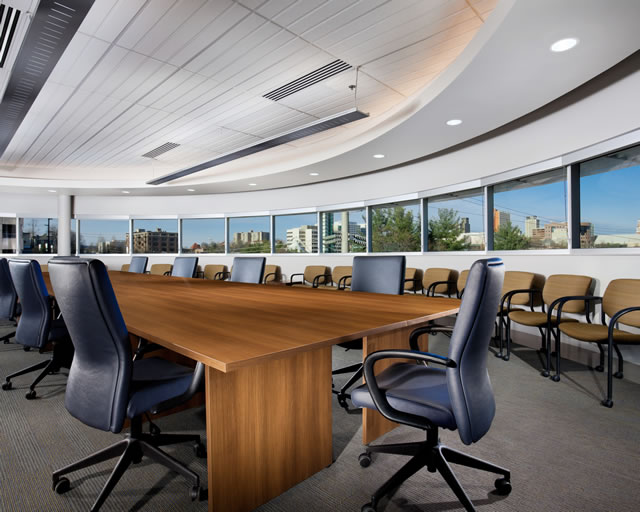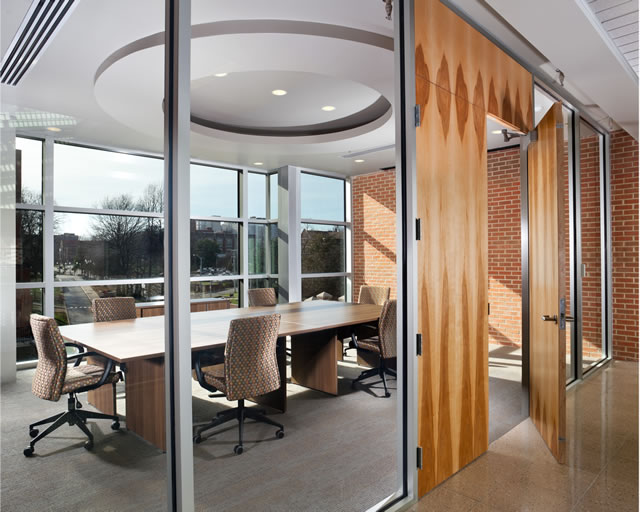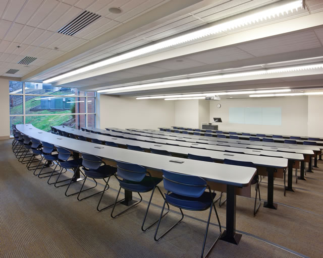 The combined departments required significant numbers of labs, faculty offices, graduate student offices, classrooms, conference rooms, and study or lounge spaces. An initiating concept placed the nearly equal areas of lab and office spaces opposite each other along generous corridor spines for convenient mutual access. The labs themselves, whether for teaching or research, were to be arrayed in rows and divided by non-load-bearing walls, permitting them to be combined in one way or another as desired in the future. The large majority of the labs were provided with generous natural light. One floor of research labs was below grade, as necessitated by the insistent limitations of the sloping site, but is desirable for experimental procedures requiring exacting control of light conditions. Being devoted to electrical and electronic issues, requirements for specialized utilities serving the labs were not as extensive as, for example, in biotechnology facilities.
