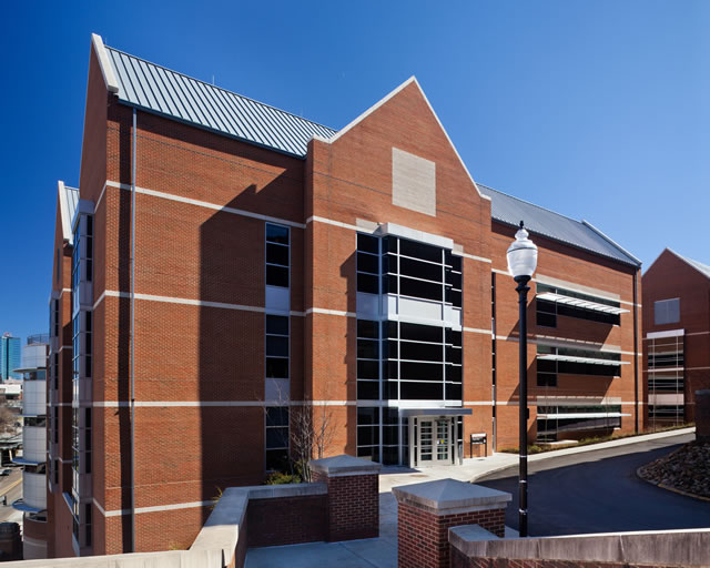 Once a space program for this new facility was devised, projections of area requirements exceeded 180,000 gross square feet. As opposed to more remote possible locations, the university chose a 1.3 acre site on the eastern flank of The Hill, facing a prominent point of entry to the campus from downtown Knoxville. Partially wooded, it had remained undeveloped for two reasons: its very limited developable acreage, and its steep slope. It was immediately apparent the new building footprint would need to occupy the large majority of the site, and that its lowest levels would need to “stair step” up that slope. These unusual factors constituted the foremost challenge of the project.