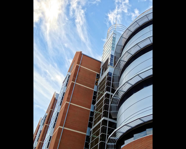 Min H. Kao Electrical Engineering & Computer Science BuildingTwo utility cores provide passenger elevators and restrooms at locations convenient to all building users, despite the facility’s complex overall footprint. A modest loading entry accesses a freight elevator which connects all levels.