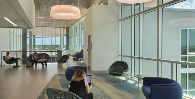 The building was designed with modern interpretations of classic materials to be contextual yet forward-thinking and cutting edge, like the education that takes place on the campus. It features sustainable, recycled-content materials with low VOC, recycled wood siding, metal wall and roof cladding, simulated stone, insulated impact resistant glazing, and exterior shades and screens. Highly-durable, low maintenance finishes “dress up” the spaces while reducing maintenance and long term operational costs.