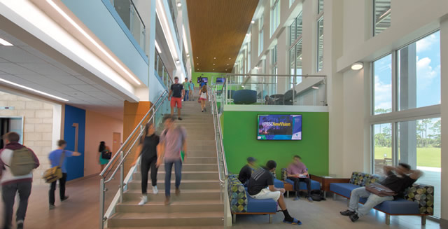 At the center of the facility and campus is a grand social staircase connecting all three stories with breakout areas for students to gather, collaborate and socialize while encouraging the active use of the vertical circulation. Additional small group and personal spaces are created in the circulation areas, optimizing each square foot of the facility to support learning. Aligning with PBSC’s commitment to sustainable construction, the new facility and campus adheres to the International Green Construction Code, developed to make buildings more efficient, reduce waste, and have a positive impact on health, safety and community welfare.