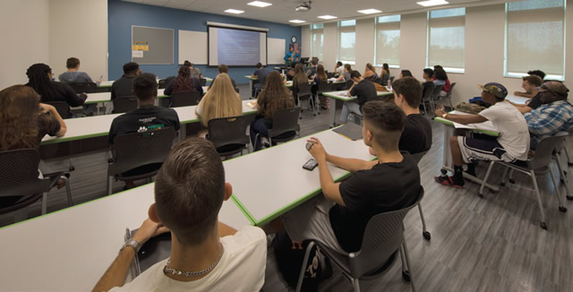 The new academic and administration building is nestled on a beautifully master planned 75-acre site with preserved wetlands, virgin woodlands and cypress trees. This first building phaseincluded a 50,000 square-foot three-story, mixed-use educational building containing classrooms, laboratories, collaborative areas, flex spaces, a 250-seat multipurpose lecture hall, a café, student services, faculty and administrative offices, and student gathering and study spaces, along with auxiliary and ancillary facilities, a central energy plant and facilities support services.