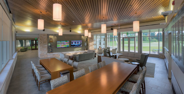 The new cutting-edge Lasch Family Golf Center serves the highly ranked men’s and women’s golf programs at Michigan State University (MSU). The center is located next to Forest Akers West Golf Course and offers an iconic, sophisticated, and welcoming home for training, studying, and socializing. This 14,888 square-foot training center replaced the Rearick Golf Center and features an indoor putting zone, team locker rooms, offices for two head coaches and two assistant coaches, and a modern student-athlete lounge. It also offers a high-tech simulation room, weight room, and kitchen area featuring nutrition and hydration stations.