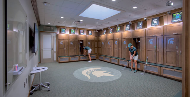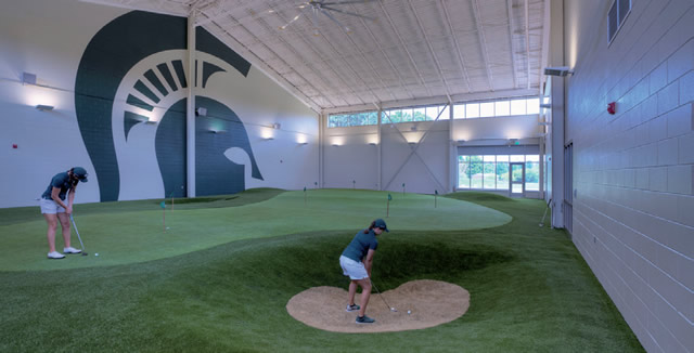 In addition to locker rooms, offices, and a lounge, this facility offers multiple options for student-athletes to improve their focus and golf game. A high-tech simulation room is equipped with a golf simulator, allowing student-athletes to virtually play on any golf course in the world. Technology records and analyzes a player’s swing for instant feedback. An indoor practice area offers year-round training possibilities. The 5,000 square-foot indoor practice green was designed to Michigan State’s terrain specifications and can be re-graded to offer limitless options.