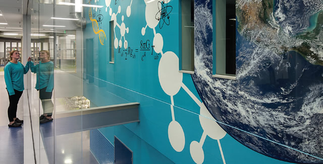 The Middle and High Schools are further differentiated by finish materials, colors, patterns and graphics, making them easy to navigate, even for students unfamiliar with the building. With clarity, transparency, abundant glazing, carefully planned adjacencies and unobstructed site lines, the large building’s layout and organization become intuitively clear.