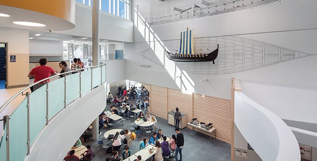 During the planning process, the design team worked with a stakeholders group to articulate the community’s desire for a variety of learning and social spaces in which students can experience science, technology, and arts education outside of the traditional classroom. While the school already had successful programs, including a “Viking Longships” class in which students explore Viking history through project-based learning, the existing physical facilities did not adequately support such programs. Having community access to spaces that supported Winthrop’s performing and visual arts was also critical to the project’s success.