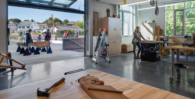 Winthrop Middle/High SchoolWithin the high school wing specialized areas include a fabrication lab that hosts Winthrop’s “Viking Longships” program, where students explore Viking history through hands-on projects. A large bi-fold garage door opens from the fab lab space onto an outdoor classroom space, providing additional flexibility for large or messy projects. The fab lab is also used for set design when productions are held in the adjacent auditorium.