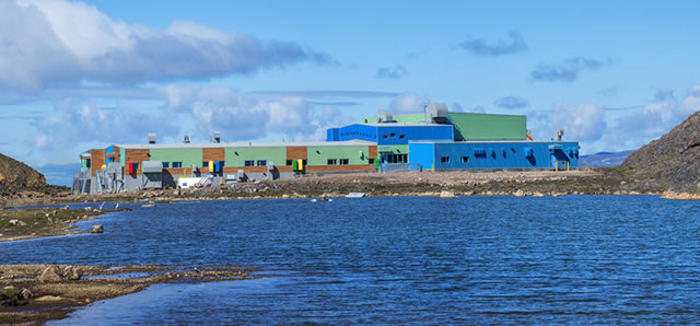 - Appropriate Construction Methods and Materials. Building in the Arctic poses a unique set of conditions. Materials can only be barged into the site. Delivery can only occur within a very short window of time when the bays are ice free. Materials need to be suited to the very harsh conditions including months of darkness, months of daylight, extreme low temperatures, and strong winds. Specialized foundations were required to accommodate the permafrost. At the same time, due to the difficulty of making repairs or finding spare parts, materials and detailing had to be both rigorous and simple. The design team was aware that color and natural materials were the historic norm in construction. The actual school design eschewed complicated details and materials; there was an emphasis to allow simple materials to be used in creative ways. Exposed ceilings and joints, an abundance of windows, and an abundance of color are apparent in the design. Where possible, the use of wood, or simulated wood, was an important design element. In order to ensure that the building would better withstand arctic conditions, the exterior siding included aluminum “planks” embossed with a wood pattern.