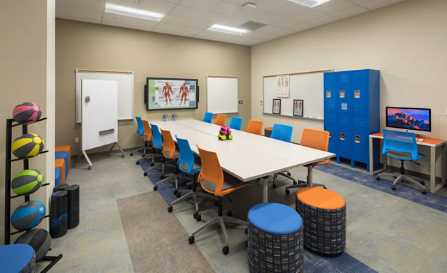 All floors support a variety of ways and places to learn and collaborate, whether it’s in the lounges at the end of each floor, classrooms, or designated study rooms. A community kitchen was integrated into the design to provide students with comprehensive and diverse experiences. Classrooms and conference rooms are equipped with audio and visual technology allowing presentations and in-class discussions to be shared remotely in real-time. Each conference room and classroom use a touchscreen scheduling system that lets students immediately see the room-use schedule and reserve the rooms themselves for future use.
