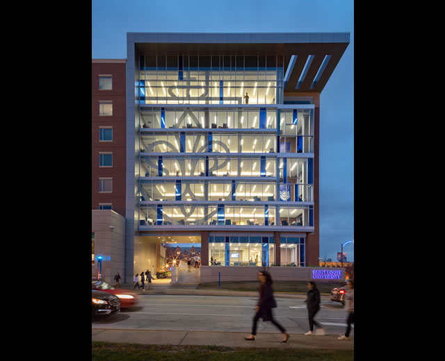 Grand Residence and Dining Hall, located on the campus of Saint Louis University (SLU), is a unique multi-purpose building combining residential, academics, socialization, dining, and three Living and Learning Communities. The Hall achieves SLU’s strategic goals of enhancing retention and recruitment and increasing and improving on-campus living.