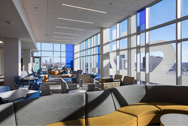 Interior spaces reinforce SLU branding with the “SLU blue” used prominently, with pops of coordinating orange, yellow, and green to reflect the liveliness of the students. The SLU logo was incorporated into custom furniture, window glass, technology cabinets, and masonry. The dining hall features a mural of the “History of the Billikin,” the school’s mascot. Glass is another interior and exterior design element used prominently. Plenty of natural light permeates classrooms and lounges with views to downtown St. Louis.