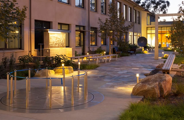 The outdoor Courtyard was a long-awaited vision of the Physics faculty. The Courtyard houses a series of physics interactives, which are used to let students tangibly experience physics principles. These interactives include a linear accelerator, a turntable for experiencing centripetal force and a spinning frame of reference, a lever arm, and parabolic acoustic mirrors to experiment with sound focusing.