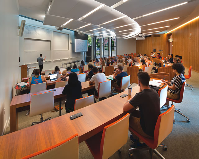 Classrooms and research labs were designed to support the unique pedagogy of teaching and learning for the Physics and Math departments. Physics prefers tables of three students—the optimal size for group work—while Math encourages in-class student participation and group problem-solving with easily moved and reconfigurable furniture and access to blackboards located on three sides of every classroom.