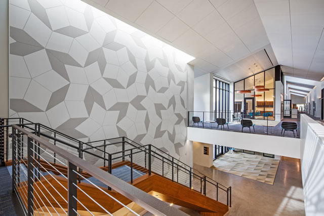 The two-story entrance opens to an expansive lobby and floating staircase that physically unites the two departments. The entrance connects the shared spaces, including the Colloquium, the administrative offices, and the Active Hub and Student Collaborative spaces. The Active Hub and Student Collaborative spaces are fully glazed on the north and south, with skylights washing a Penrose feature wall. Daylighting enters from multiple directions, often washing surfaces or reflecting off sunshades to balance the light and animate the forms.
