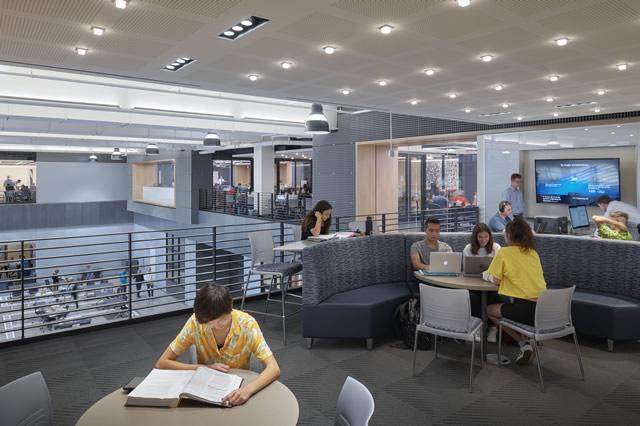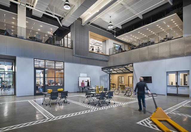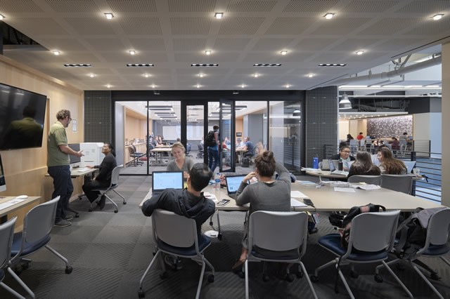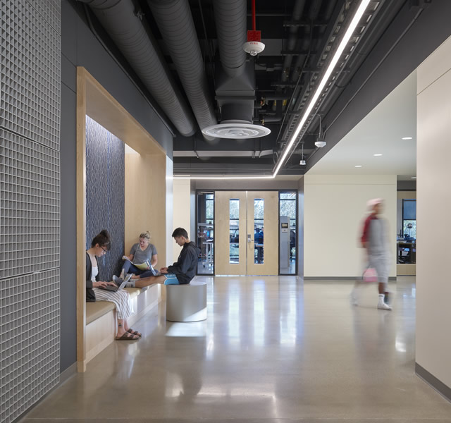The design team took an exposed and contemporary aesthetic approach to the interior environment, shifting from the traditional campus framework to an environment that models contemporary workplaces in engineering and science. Utilities are exposed, allowing students to see the various systems at work. Meanwhile, large areas of glazing create necessary acoustical and environmental separations while providing views into project activities beyond. Industrial materials such as steel grating and plywood are transposed as interior finishes that lend acoustical value, color, and texture to the technical environment.