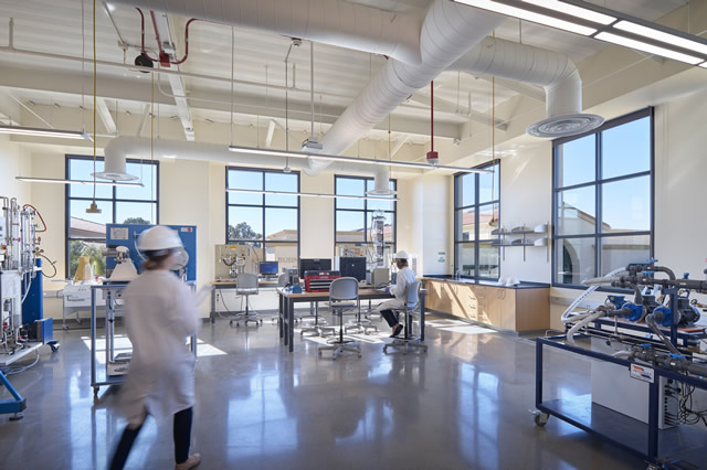 This 100,000-square-foot campus facility is a distinctive synthesis of form and function. Two wings of classroom and administrative space that are rendered in the campus vernacular bracket a voluminous engineering projects hall—providing flexible space for work, exhibits, and student collaboration. The facility brings together a wide range of engineering programs and creates a vibrant space for exploration across disciplines. The building houses wet labs, dry labs, active learning classrooms, computer labs, and various maker shops to support a hands-on, career-focused pedagogy. The expansive projects hall interconnects interior and exterior work space. An outdoor yard extends from the hall, providing exterior space and a staging area for large projects. An accessible rooftop features a solar-thermal lab, photovoltaic farm, and other open space for learning and experimentation.